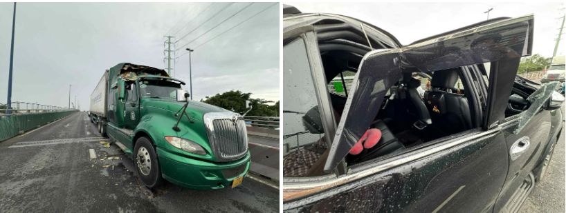 May mắn, sự cố không gây thương vong nhưng khiến tài xế, phụ xe container cùng nhiều người bên trong ôtô 7 chỗ một phen hoảng vía.