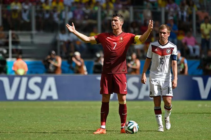 Cristiano Ronaldo (áo đỏ) phản ứng trong trận Bồ Đào Nha thua Đức 0-4 tại World Cup 2014. Ảnh: AFP