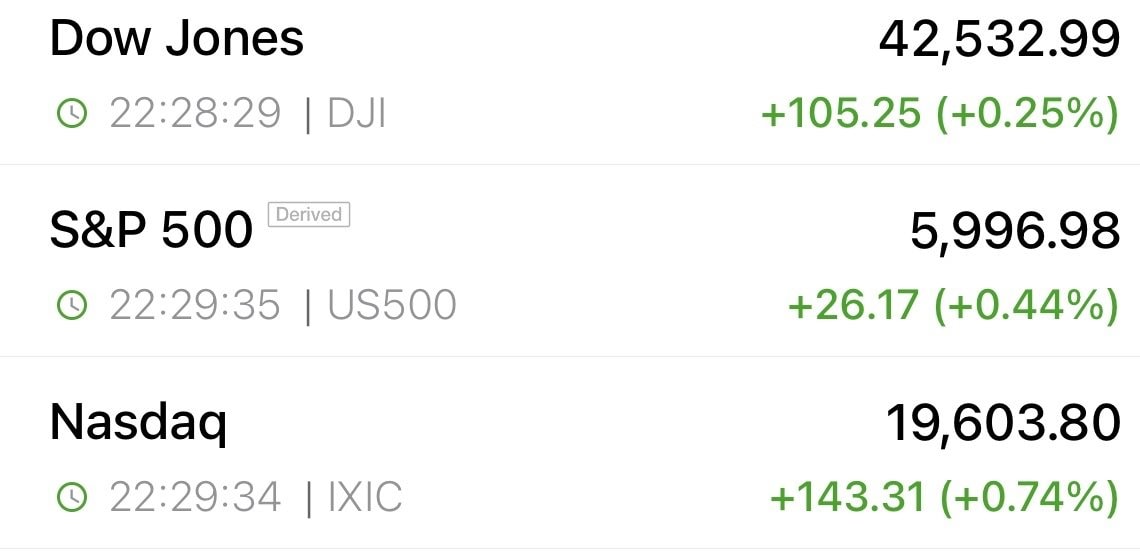 Tính tới 22h28 theo giờ Hà Nội, Dow Jones tăng 105 điểm, tương đương 2,5% lên 42.530 điểm. S&P 500 và Nasdaq cũng lần lượt tăng 0,41% và 0,71%.