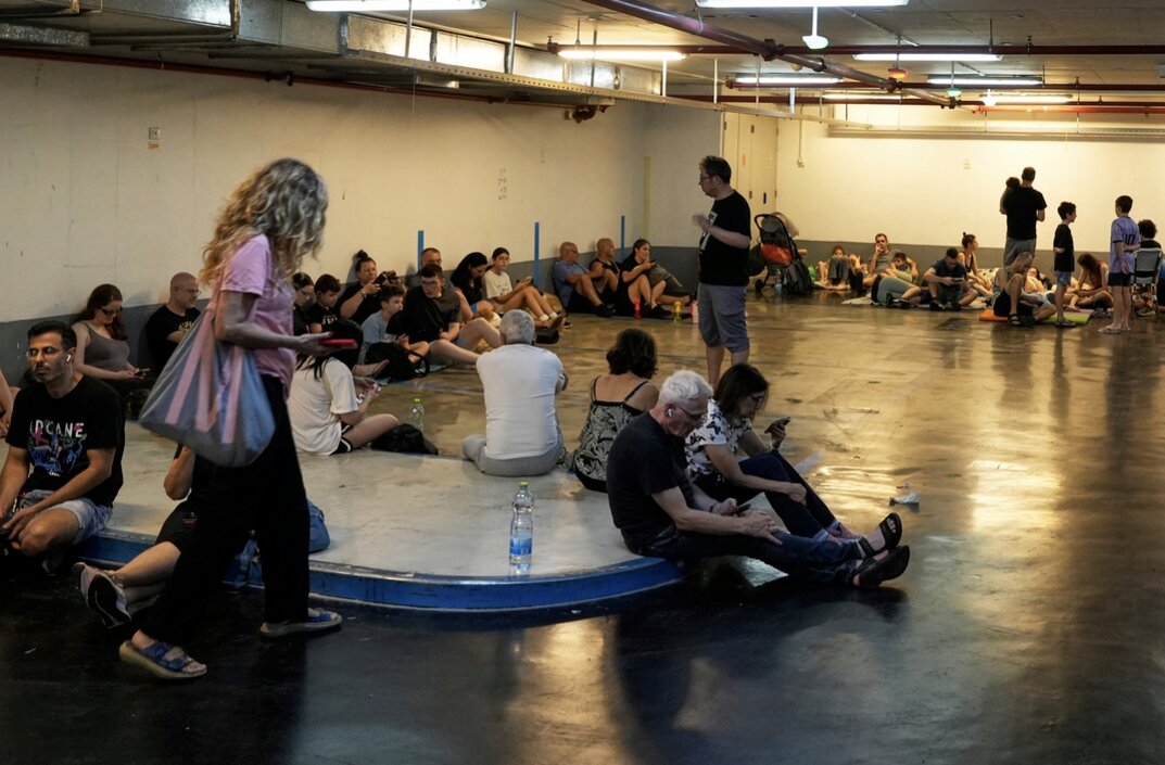 Người dân vào hầm trú ẩn khi còi báo động vang lên, cảnh báo tên lửa sắp bắn tới TP Tel Aviv - Israel ngày 15-6.Ảnh: AP