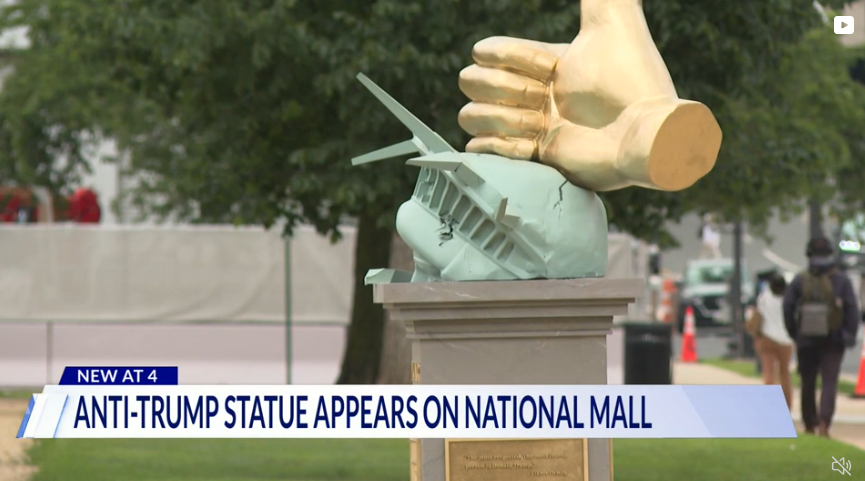 Một người xem của DC News Now đã chia sẻ những bức ảnh về bức tượng được phát hiện vào thứ Ba, với hình ảnh ngón tay cái bằng vàng lớn đang nghiền nát đầu Tượng Nữ thần Tự do, cùng với những câu trích dẫn được cho là của nhiều nhà lãnh đạo nước ngoài, bao gồm Tổng thống Nga Vladimir Putin và Thủ tướng Hungary Viktor Orbán.