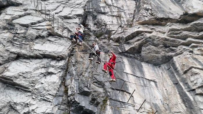 Du khách đang leo lên "Thang trời" dài 168 m. Ảnh: CNN.