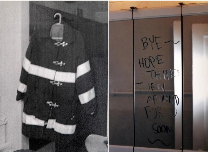 Chiếc áo đồng phục lính cứu hỏa và lời nhắn viết trên gương của Peter Braunstein. Ảnh: NYP