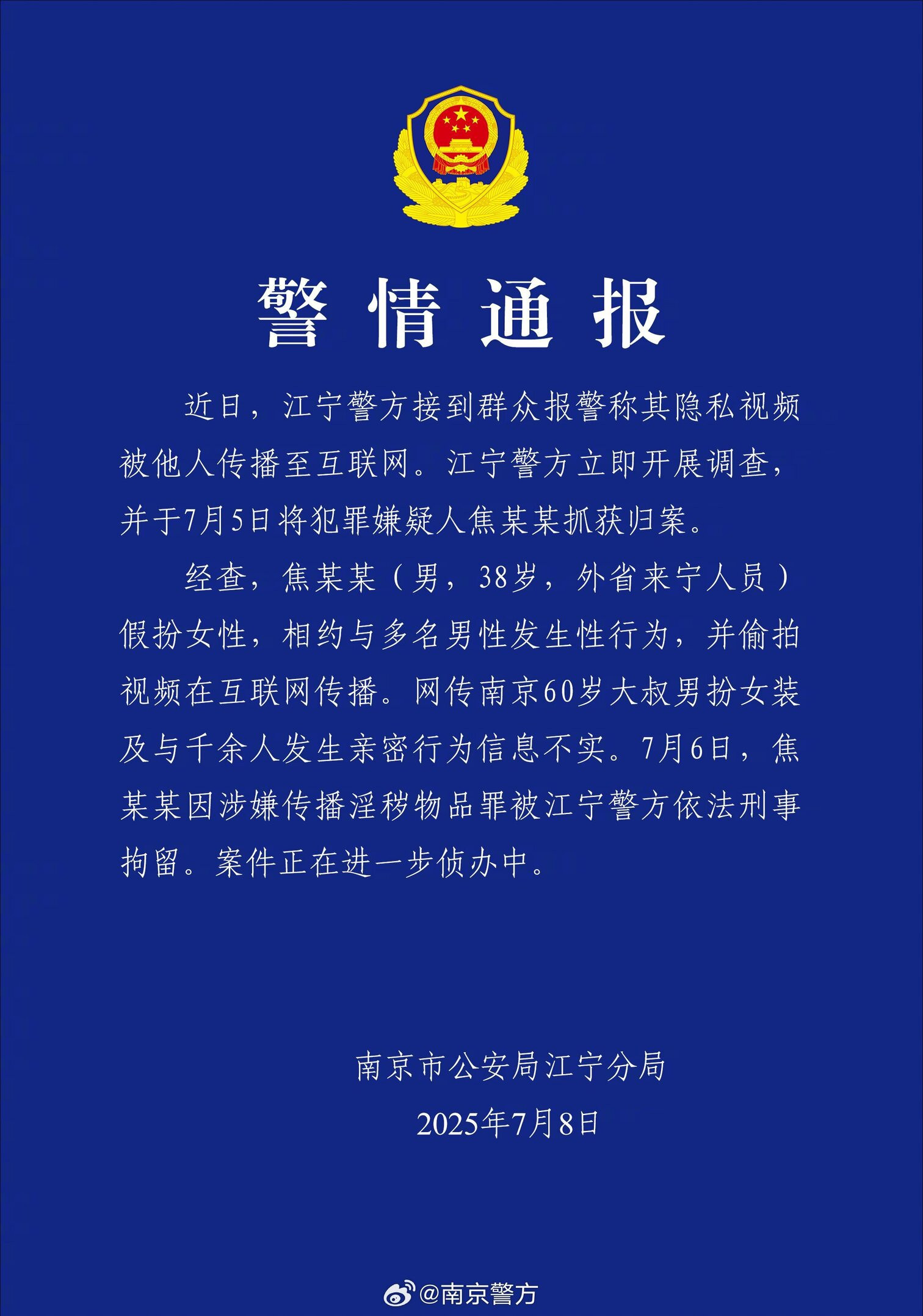 Cảnh sát quận Giang Ninh, TP Nam Kinh xác nhận rằng, nghi phạm chính có biệt danh "chị Hồng" trong vụ việc nêu trên là nam giới, họ Tiêu, 38 tuổi. Tiêu là người ngoại tỉnh, đến Nam Kinh sinh sống.