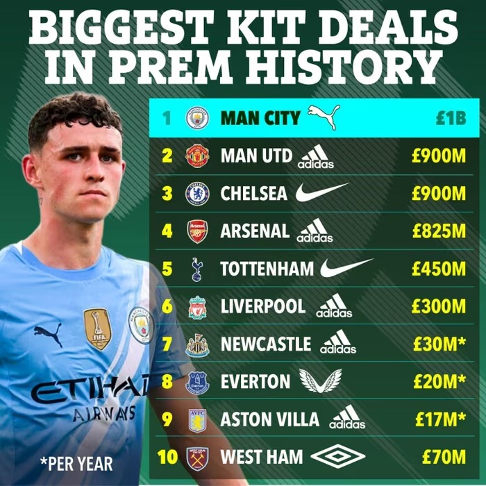 Tốp 10 hợp đồng áo đấu giá trị cao nhất tại Ngoại hạng Anh