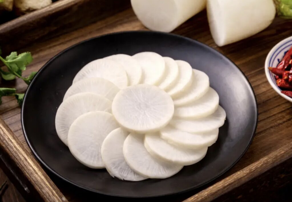 Củ cải trắng giúp tăng cảm giác ngon miệng. Chúng ít calo, giàu vitamin C và chất xơ. Theo Đông y, ăn củ cải trắng có thể thanh nhiệt sinh tân, kiện tỳ khai vị, ăn kèm với các loại thịt như thịt cừu còn có thể khử mùi hôi và giảm ngấy.