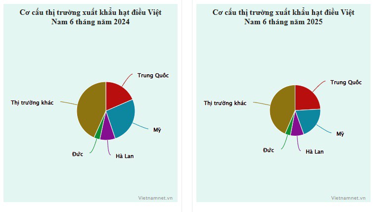 Số liệu thống kê cũng cho thấy, trong tháng 6/2025, Trung Quốc, Mỹ, Hà Lan, Đức và Các Tiểu vương quốc Ả Rập Thống nhất là 5 thị trường xuất khẩu hạt điều lớn nhất của Việt Nam. Xuất khẩu hạt điều sang Mỹ và Đức ghi nhận tăng trưởng âm, trong khi các thị trường còn lại đều tăng so với cùng kỳ năm 2024.