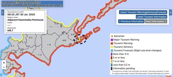 Sau trận động đất tại vùng Viễn Đông Nga, cơ quan Khí tượng Nhật Bản (JMA) đã nâng mức cảnh báo sóng thần, cho biết có khả năng xuất hiện sóng cao từ tới 3 m dọc theo các bờ biển Thái Bình Dương, đặc biệt là tại Hokkaido, Honshu và Kyushu. Thời gian dự kiến sóng thần ập vào là từ 10h đến 11h30 sáng (giờ địa phương). Ảnh: Reuters.