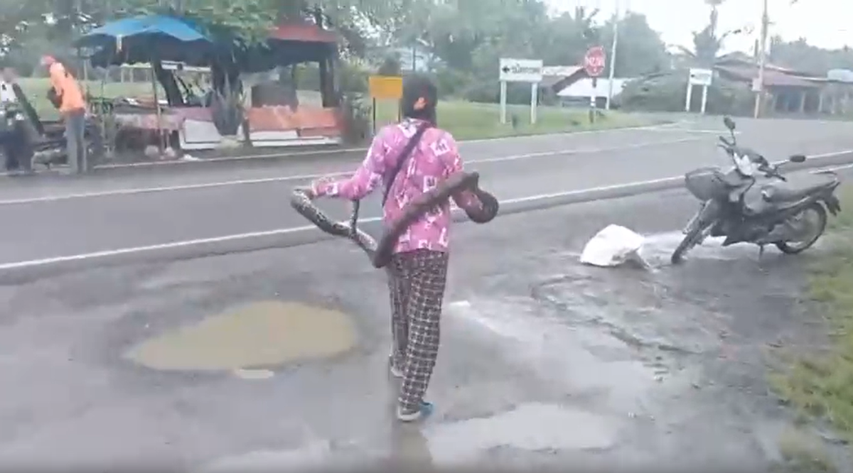 Người phụ nữ tay không bắt con trăn dài 2 mét giữa đường.
