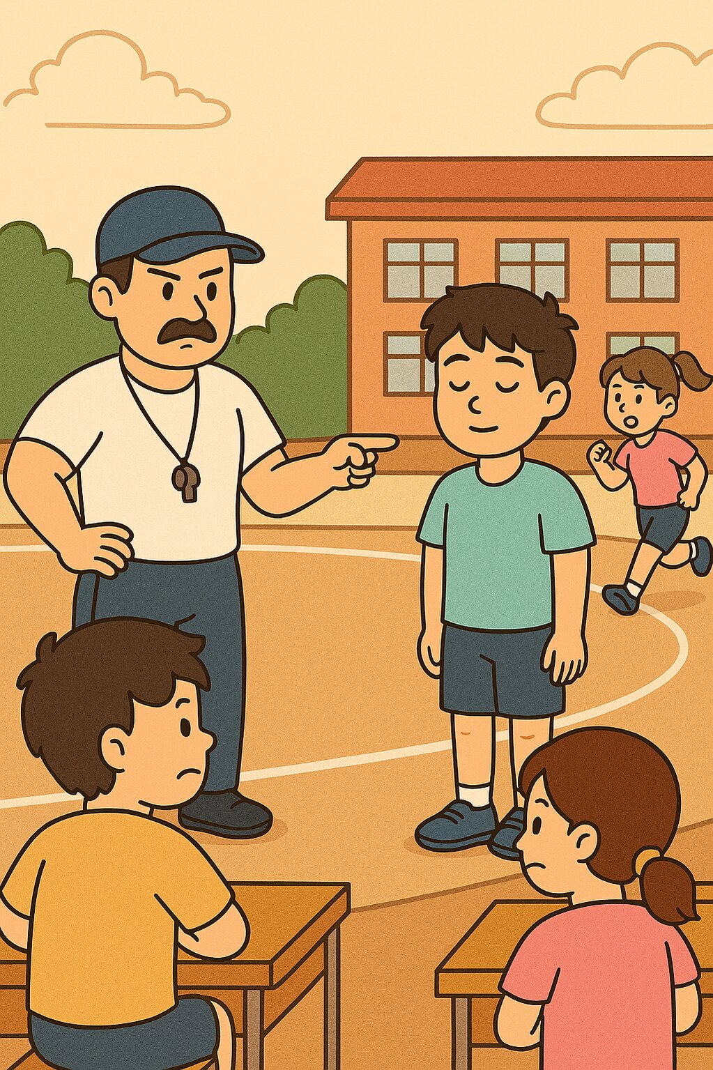 Trong tiết thể dục, thầy giáo yêu cầu cả lớp chạy 5 vòng sân trường. Ai không chạy đủ sẽ bị ghi tên.