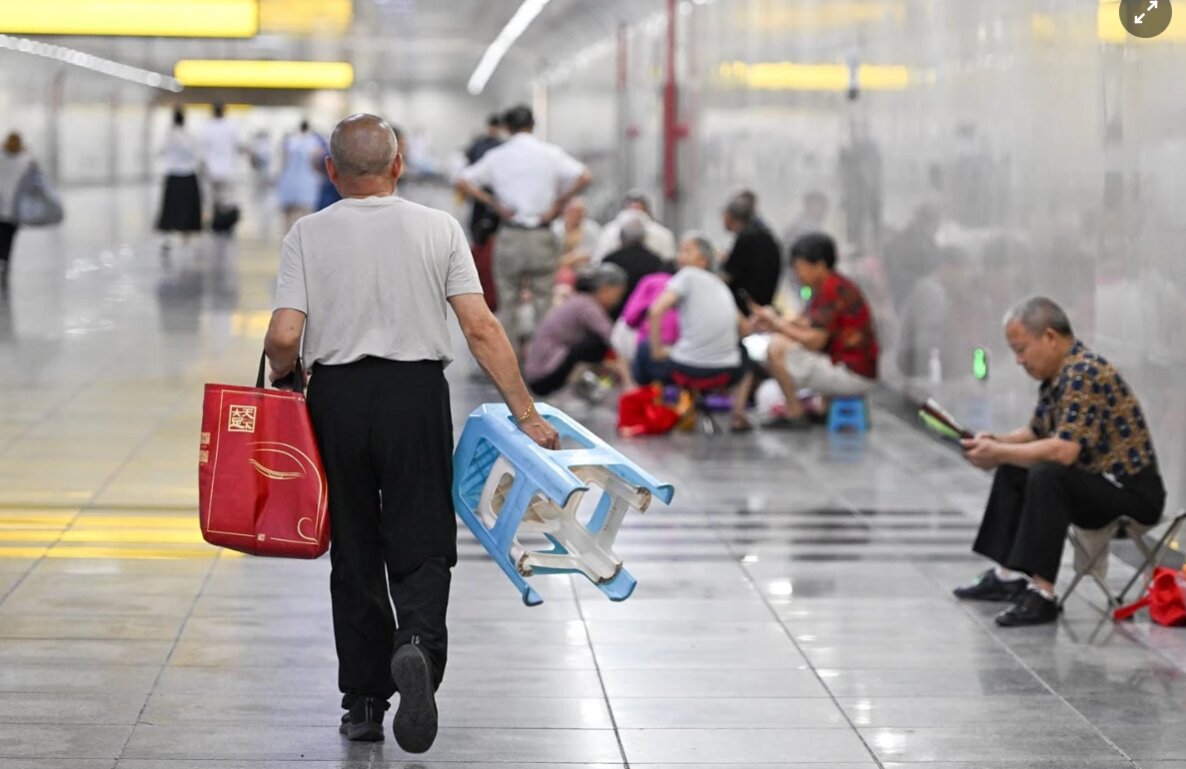 Một người đàn ông lớn tuổi mang theo ghế đẩu đến ga tàu điện ngầm tránh nóng ở Trùng Khánh hôm 15/7. Ảnh: VCG.