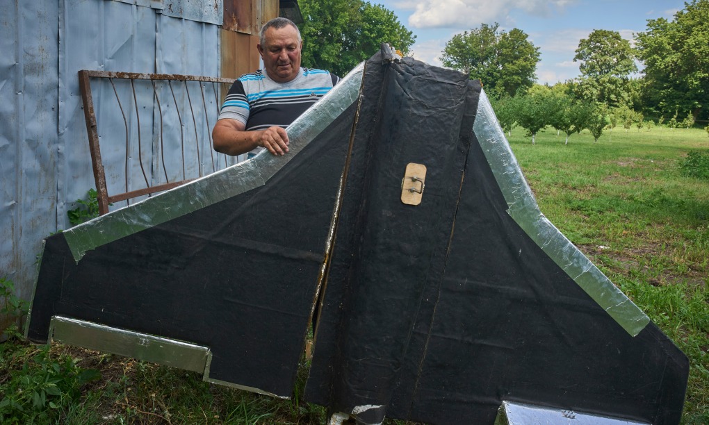 Người dân tại tỉnh Kiev bên cạnh xác UAV Nga hôm 3/8. Ảnh: AP