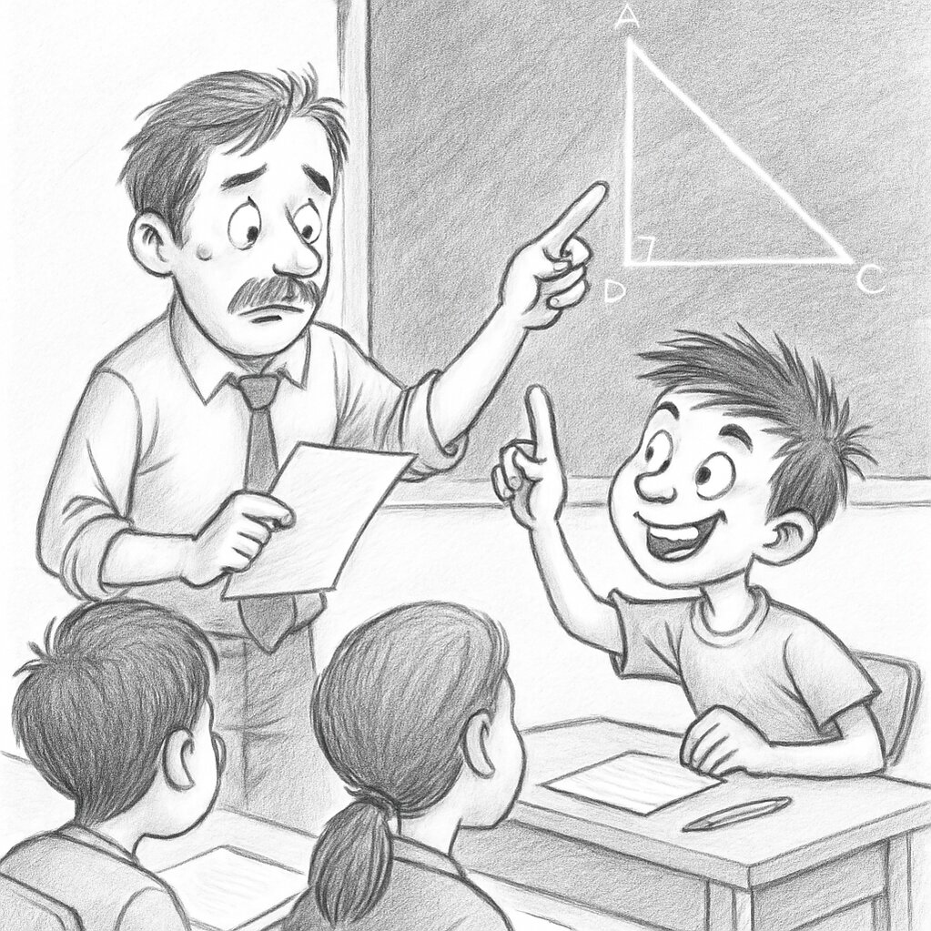 — "Dạ em nghiêm túc mà thầy! Em đang trầm trồ cái tam giác ABC này. Nó vuông vức, gọn gàng, lại còn... có thể tính ngay được cạnh huyền theo định lý Pythagore. Em thấy nó giống như kiểu tam giác... lý tưởng để đi thi vậy!"