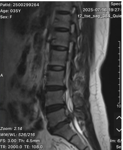 Kết quả chụp cộng hưởng từ (MRI) cột sống thắt lưng cho thấy bệnh nhân bị thoát vị đĩa đệm L5-S1 thể di trú - một thể nặng, với khối thoát vị lệch ra sau và sang phải, gây chèn ép nghiêm trọng lên rễ thần kinh. Đây chính là nguyên nhân dẫn đến đau kéo dài, rối loạn cảm giác và suy giảm vận động.