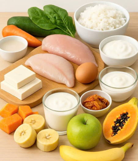 Sữa chua, sữa lên men, kim chi ít cay: Giúp cân bằng hệ vi sinh đường ruột, hỗ trợ tiêu hóa và giảm đầy hơi.