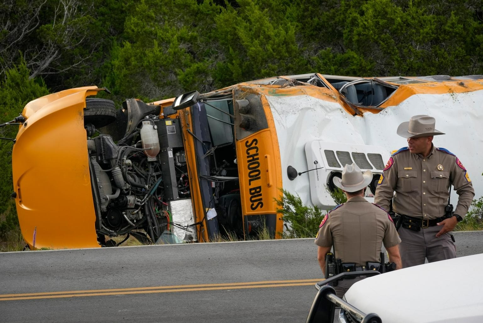Sĩ quan Billy Ray thuộc Sở An toàn Công cộng Texas cho biết, nguyên nhân đang được điều tra. Tại hiện trường, chiếc xe buýt màu vàng nằm nghiêng bên vệ đường, phần nóc hư hại, nhiều cửa kính vỡ vụn.