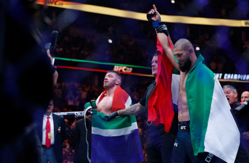 Khamzat Chimaev được giơ tay, công bố là người chiến thắng, trở thành tân vương hạng trung UFC. Ảnh: Reuters