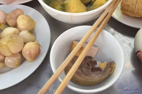 Ngoài những món quen thuộc mang đậm hương vị vùng miền như gà luộc, canh miến, giò lụa, chả mỡ, tôm luộc…, Hồng còn thấy xuất hiện cả trứng vịt lộn, khiến cô khá ngạc nhiên.