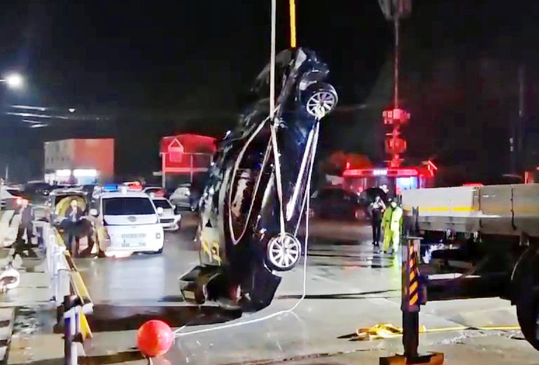Hiện trường trục vớt chiếc xe chở theo vợ và hai con trai. Ảnh: Yonhap