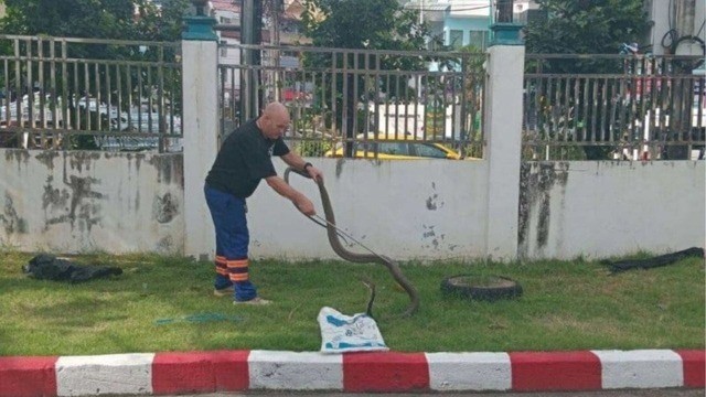 Một nhân viên bảo vệ ở Phuket (Thái Lan) đã phải nhập viện khẩn cấp sau khi bị rắn hổ mang chúa cực độc cắn vào tay trong lúc liều lĩnh bắt nó bằng tay không.