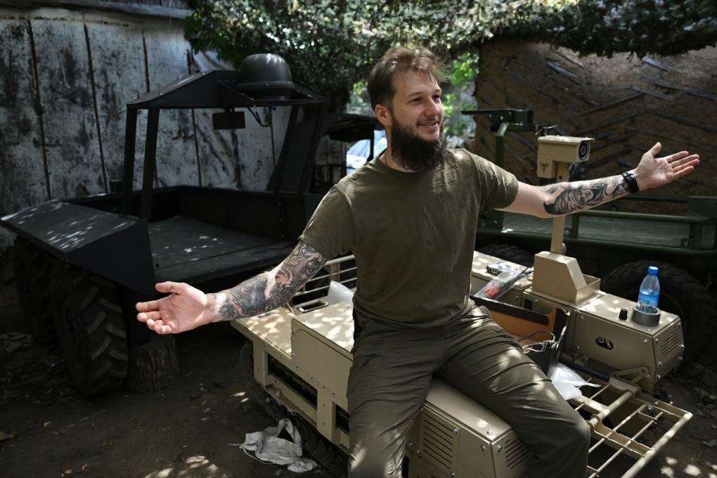 Tại một bãi huấn luyện ở miền đông Ukraine, anh chỉnh hướng di chuyển của robot qua bộ điều khiển cầm tay có màn hình. Krop điều khiển robot băng qua một cánh đồng hoa hướng dương và xoay tròn tại chỗ, trong khi một đồng đội giữ chặt bệ đỡ để đưa người bị thương lên xe.