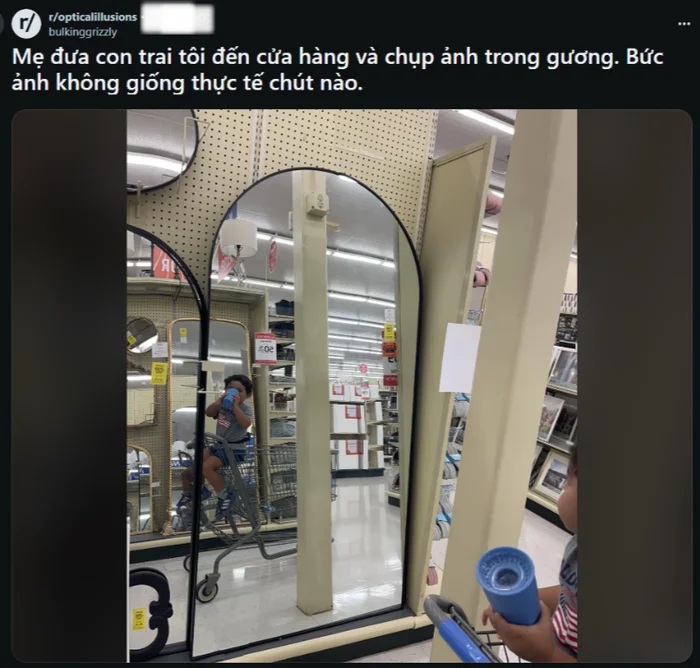 Dù chỉ là một buổi đi chơi công viên hay khoảnh khắc con phản ứng với sản phẩm trong siêu thị, những tấm ảnh này đều lưu giữ ký ức đặc biệt. Đi mua sắm cùng cháu trai 2 tuổi không ngờ rằng tấm ảnh chụp phản chiếu của bé trong gương lại khiến bà giật mình trước hình ảnh phản chiếu lại. Tuy nhiên, điều kỳ lạ là hình ảnh phản chiếu trong gương lại không trùng khớp với tư thế và hành động thực tế của cháu.