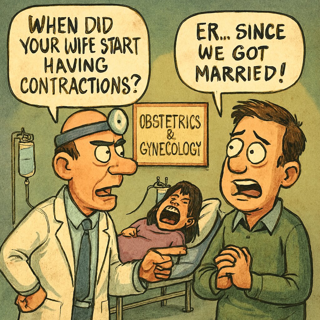 Bác sĩ cau mày: – Vớ vẩn! Thế mà cũng làm bố! Tôi hỏi là vợ anh bắt đầu gào thét như thế này từ lúc nào?