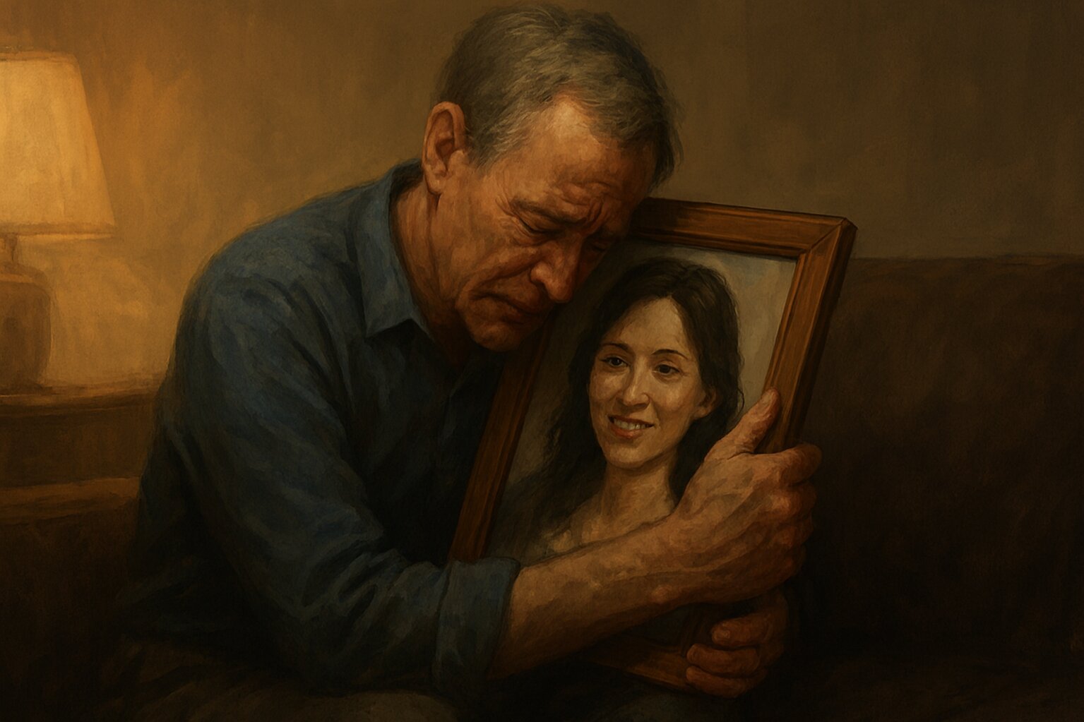 Mỗi đêm, ông ngồi bên khung ảnh, tay run run chạm vào gương mặt ấy. Cái bóng của người vợ vẫn ở đó — trong từng góc nhà, từng hơi thở, từng giấc mơ.