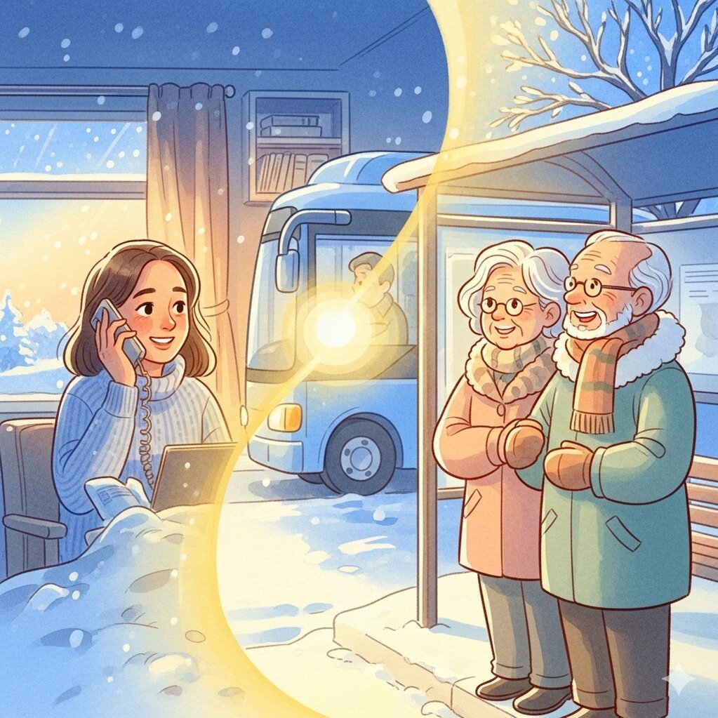 Tại ga xe bus tôi không ngừng dậm chân cho đỡ lạnh, trời vẫn còn tối đen như mực, đứng bên cạnh tôi là hai ông bà lão tóc bạc trắng.