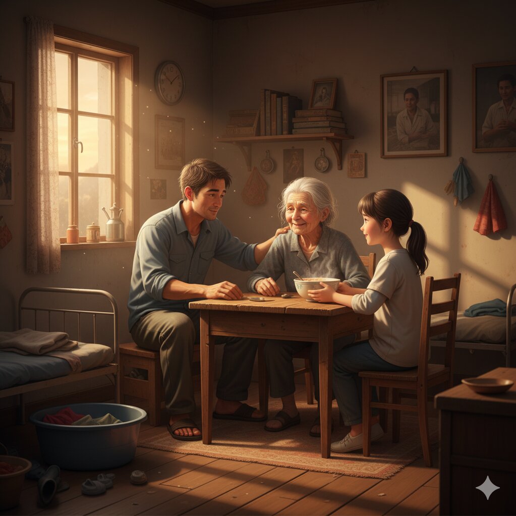 Người đến bữa mà thấy Trạo đi làm vắng sợ bà cụ ăn uống qua loa nên bưng sang một bát canh. Cũng có hôm kéo bà cụ sang ăn cùng, thêm người thì thêm vui. Việc Trạo mang bà cụ về nuôi như cơn mưa mát lành tưới tắm những tâm hồn đang khô héo vì chật vật mưu sinh, lo toan nhàu nhĩ. Họ ngẫm thấy cuộc đời còn bao điều tốt đẹp, nhẹ nhõm thôi mà sống để thương nhau.
