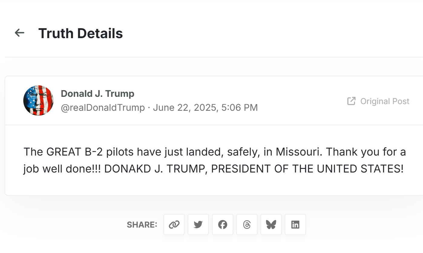 Trong một bài đăng khác trên Truth Social, trong đó ông cảm ơn các phi công B-2 đã tham gia cuộc tấn công Iran, Trump đã viết sai tên mình thành "DONAKD J. TRUMP, TỔNG THỐNG HOA KỲ!"