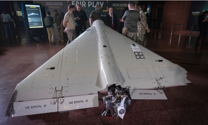 Xác UAV Nga được Ukraine trưng bày tại hội nghị quốc tế ở Kiev hôm 27/6. Ảnh: AP