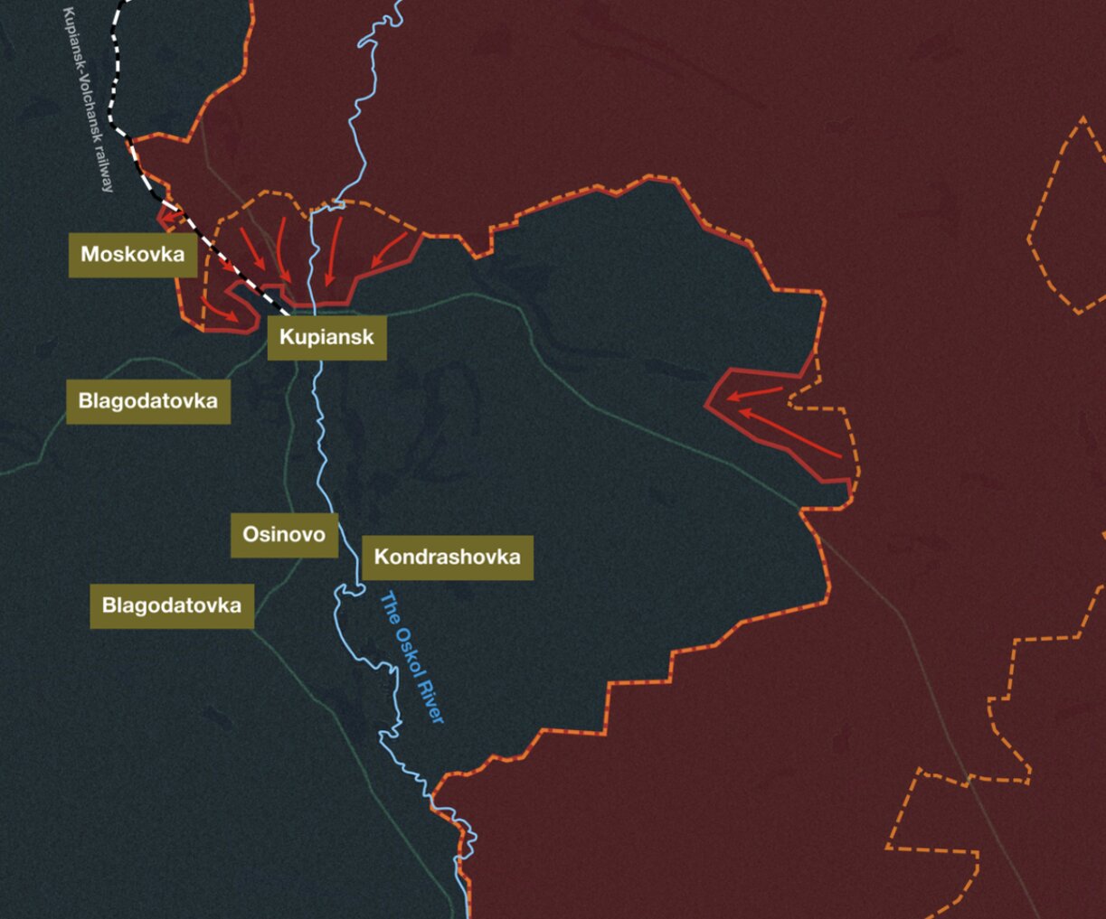 Giữa tháng 8, giao tranh lan đến Kupiansk. Đến ngày 10/9, quân Nga đã chiếm quảng trường trung tâm, tòa nhà hành chính, một số chung cư cao tầng và cả nhà máy đường ở rìa đông thành phố.
