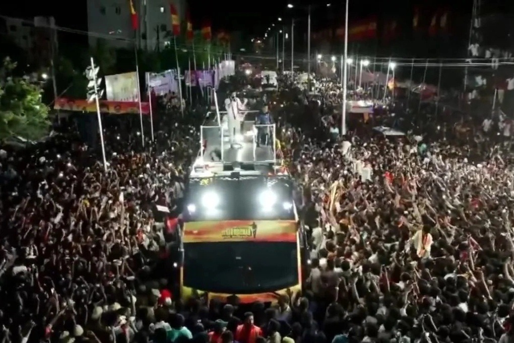 Các đoạn video do truyền thông địa phương ghi lại cho thấy hàng nghìn người bao vây một xe vận động lớn, nơi ông Vijay đứng trên nóc và phát biểu. Trong cuộc mít tinh, ông Vijay ném chai nước xuống cho những người ủng hộ bị ngất xỉu và kêu gọi cảnh sát hỗ trợ khi đám đông trở nên mất kiểm soát.