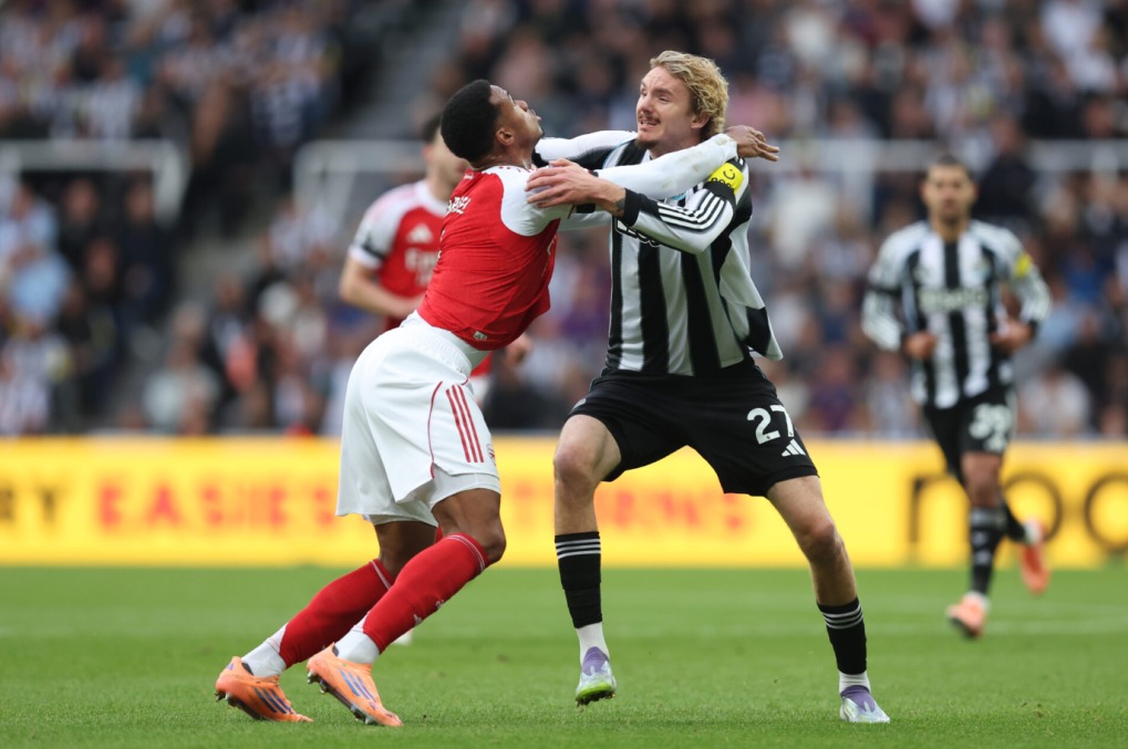 Phút 34, Sandro Tonali tạt bóng để Woltemade, tiền đạo được tuyển mộ với tổng phí 105 triệu USD từ Stuttgart, bật cao đánh đầu tung lưới David Raya, giúp Newcastle vượt lên. Gabriel cho rằng anh bị Woltemade đẩy sau, nhưng pha quay chậm cho thấy tác động của tiền đạo Newcastle là rất nhẹ. VAR cũng không vào cuộc.