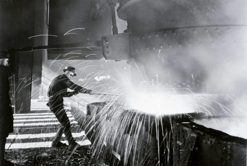 Tại Nhà máy South Chicago của Tập đoàn Thép Carnegie-Illinois, một công nhân đang lấy mẫu trong quá trình đúc các thỏi thép nặng 32.000 pound. Được thực hiện giữa quá trình, những thử nghiệm này đảm bảo thép đáp ứng chính xác các tiêu chuẩn hóa học - phản ánh quy mô công nghiệp và sự kiểm soát khoa học đã định hình nên ngành sản xuất thép của Mỹ trong thế kỷ 20. Ảnh: Getty.