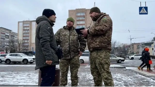 Các quan chức tuyển quân Ukraine kiểm tra giấy tờ của một người đàn ông trên phố. Ảnh BBC News
