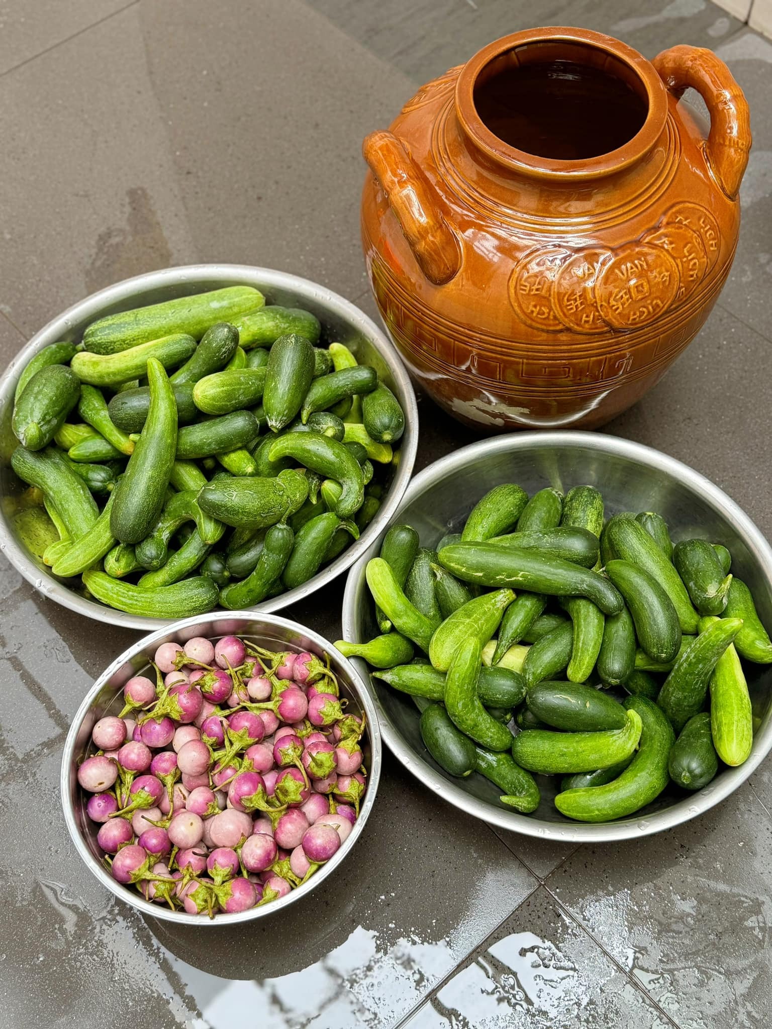 - Dưa leo chua cắt bỏ ruột thái lát vừa ăn. Cà pháo cắt đôi, rửa bóp sạch hạt, không ăn hạt cà nhiều nên rửa kĩ bằng nước.