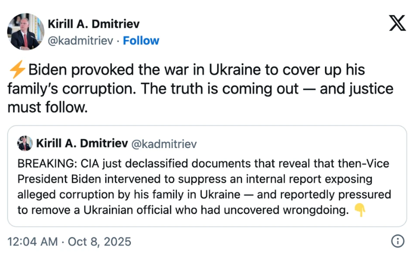 Bài đăng của ông Kirill Dmitriev, cố vấn đầu tư của Điện Kremlin, đăng trên mạng xã hội X nói rằng cựu Tổng thống Mỹ Joe Biden đã châm ngòi cho cuộc xung đột Ukraine nhằm che giấu các hoạt động tham nhũng của gia đình mình. Ảnh chụp màn hình tài khoản mạng xã hội X của ông Kirill Dmitriev