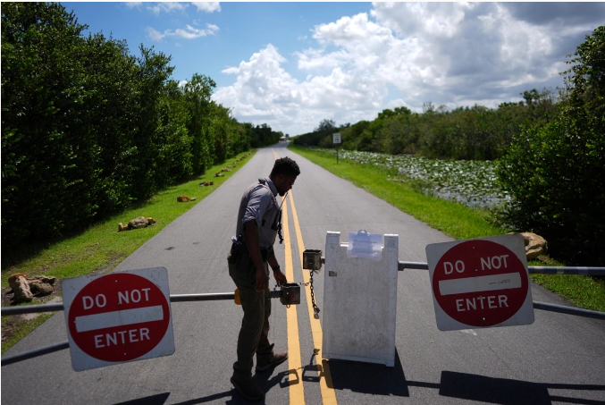 Nhân viên Cơ quan Công viên Quốc gia Mỹ chặn đường vào một khu vực ở công viên quốc gia Everglades, bang Florida ngày 1/10. Ảnh: AP