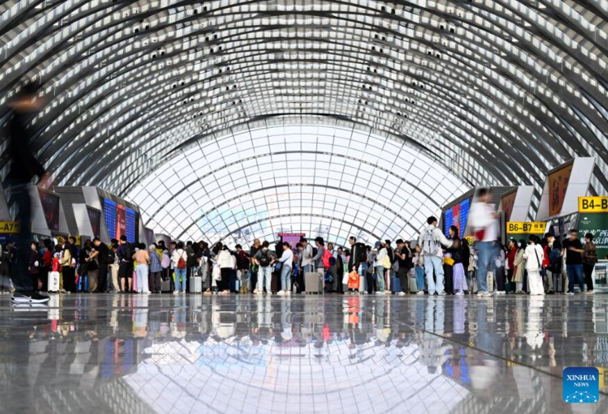 Hành khách tại sảnh chờ ga đường sắt Tây Thiên Tân, miền Bắc Trung Quốc ngày 7/10/2025. Ảnh: Tân Hoa Xã