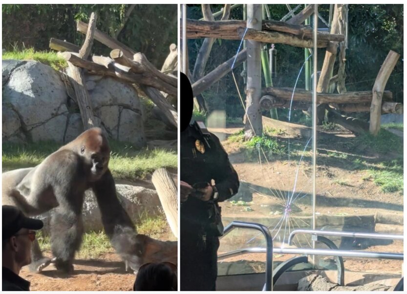 Một đoạn video gây sốc ghi lại khoảnh khắc khỉ đột khổng lồ lao vào vách kính chuồng nuôi tại sở thú California, làm vỡ kính và khiến khách tham quan hoảng loạn.
