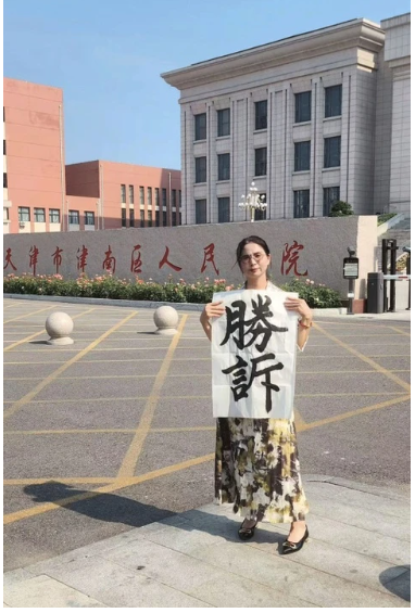 Cui Lili cầm tấm biển có dòng chữ "sheng su" (thắng kiện) được viết bằng chữ Hán bên ngoài Tòa án. Ảnh: Tide News.