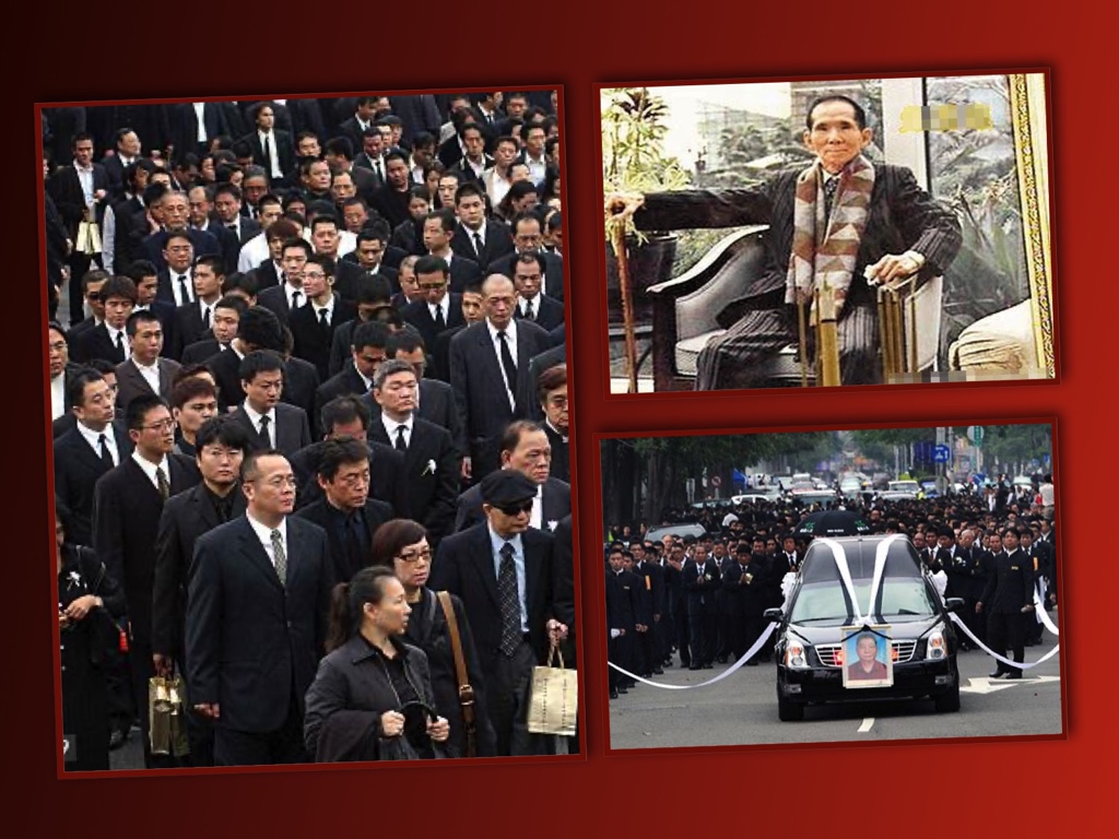 Ngày đưa tang, báo Taiwan News tường thuật gần 10.000 “gangsters” khắp Đài Loan đổ về. Không chỉ anh chị bản xứ, mà còn có đại diện Yamaguchi-gumi, Sumiyoshi-kai bên Nhật, ông trùm 14K Hồng Kông, đại gia sòng bạc Macau… kéo đến với phái đoàn đông như đi dự hội nghị thượng đỉnh giang hồ.