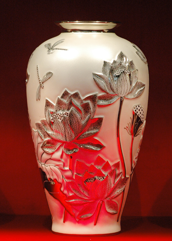 Bình sứ chủ đề Ngân sen có hoa văn nổi, các họa tiết này được vẽ màu bằng tay ở nhiệt độ cao. Giá bán 63 triệu đồng, tương đương 3.000 USD.
