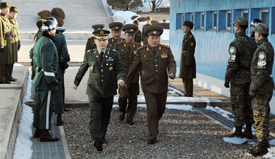 Phái đoàn Bắc Hàn băng qua ranh giới hai miền Nam Bắc để đến Panmunjom thương thuyết với Nam Hàn hôm Thứ Tư, trong bức h́nh do Bộ Quốc Pḥng Nam Hàn cung cấp. Nhưng chỉ một ngày sau, Bắc Hàn cắt ngang cuộc họp với lư do “không cảm thấy có nhu cầu thảo luận với bọn phản quốc khi mà chúng không muốn thấy có sự cải thiện trong mối quan hệ.” (H́nh: AP Photo/Defense Ministry)