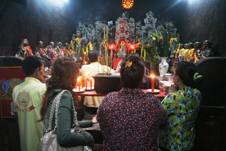 Chiều 16/2 (tức ngày 14 tháng Giêng) nhiều người đến ngôi chùa vốn được truyền tai là linh thiêng này để khấn nguyện. Các bàn thờ Thần Hoàng, ông Hổ, thần Tài… đông nghịt người vào ra. Trước bàn thờ ông Tơ, bà Nguyệt, cũng là nơi thờ 12 Thánh mẫu (mẹ Sanh, mẹ Độ) ḍng người càng đông hơn. Đây chính là nơi để các bạn trẻ đến cầu duyên. C̣n các bậc cha mẹ nếu hiếm muộn th́ khấn nguyện để sớm có con, ai có con rồi th́ cầu xin cho con thông minh, khỏe mạnh, học giỏi, thành đạt…