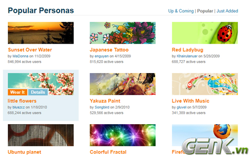 Personas là tính năng được bổ sung vào Firefox từ phiên bản 3 và thật may mắn là tính năng này hoàn toàn tương thích với phiên bản mới của Mozilla Firefox. Bạn có thể tìm cho mình những hình ảnh Personas đẹp long lanh ở đây. Khi lựa chọn ảnh, bạn chỉ cần di chuột vào ảnh Personas là Firefox đã tự động thay thế hình vào thanh công cụ. Nếu muốn sử dụng ảnh đó, bạn chỉ cần Click nút Wear it.