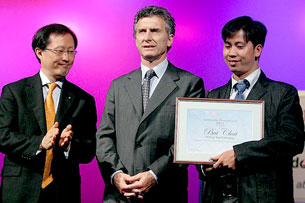 Từ trái sang: Giám đốc IPA Youngsuk “Y.S.” Chi, Thị trưởng Mauricio Macri, và Bùi Chát tại lễ trao giải Tự Do Xuất Bản năm 2011 ở Buenos Aires hôm 25-4-2011.