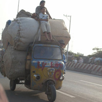 Trong giờ cao điểm, hàng trăm ngh́n chiếc taxi tải giật từng bước nhỏ trên các phố, như một cái chợ cuốn hằng tuần hôi hám. Các mũ bảo hiểm, hầu như không theo chuẩn nào. Chừng nào mà các xe gắn máy c̣n quá tải, th́ mọi chuyện vẫn tốt đẹp. Tại sao mọi chuyện diễn ra xấu đi? Chính sự hỗn loạn khiến ḍng chảy giao thông quá chậm, đến mức không có tai nạn lớn nào xảy ra nổi.